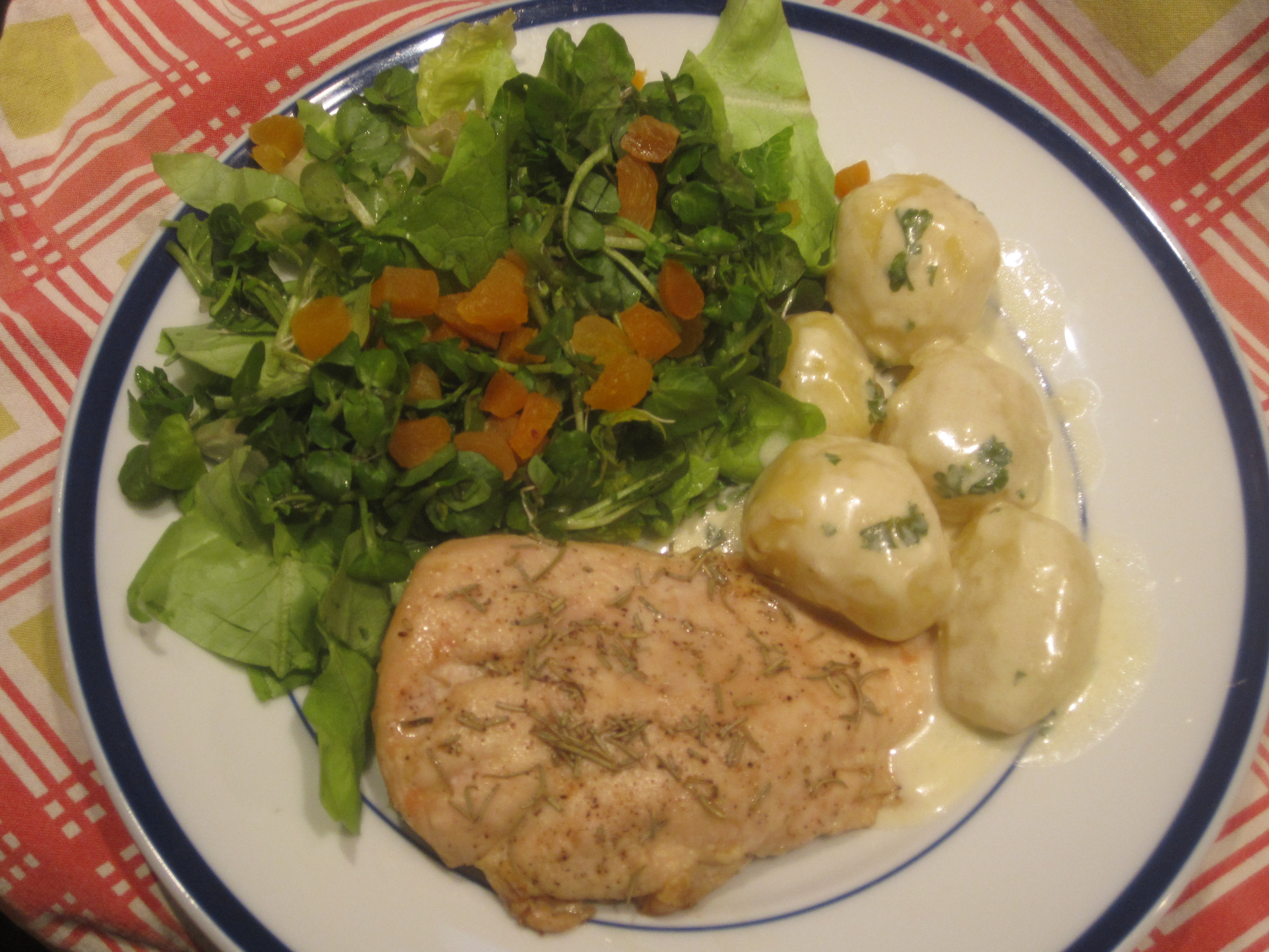 And, it reminded me that I owe my blog a recipe. I made this for dinner after our last CSA pick-up. It uses Everblossom potatoes, parsley, butter crunch lettuce and watercress. I served it with baked chicken breast tossed with olive oil, salt pepper and Everblossom rosemary. My oldest, Audrey, actually cheered, “Hooray Hooray, Mamma made the best supper today!” I think she knows exactly what she’s doing.