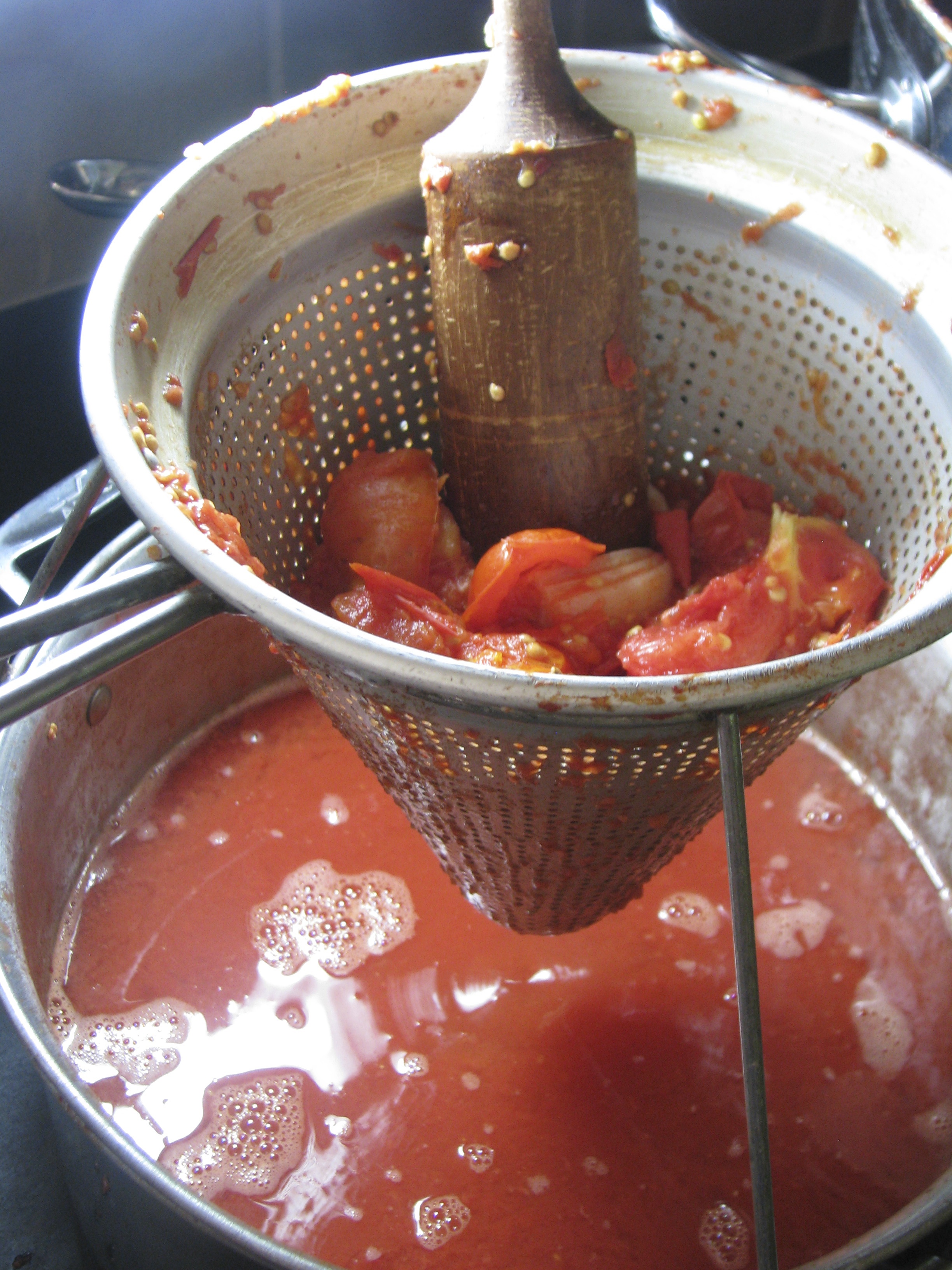 • Strain tomato mixture through the chinois sieve, using the pestle to strain juice into another large pot.