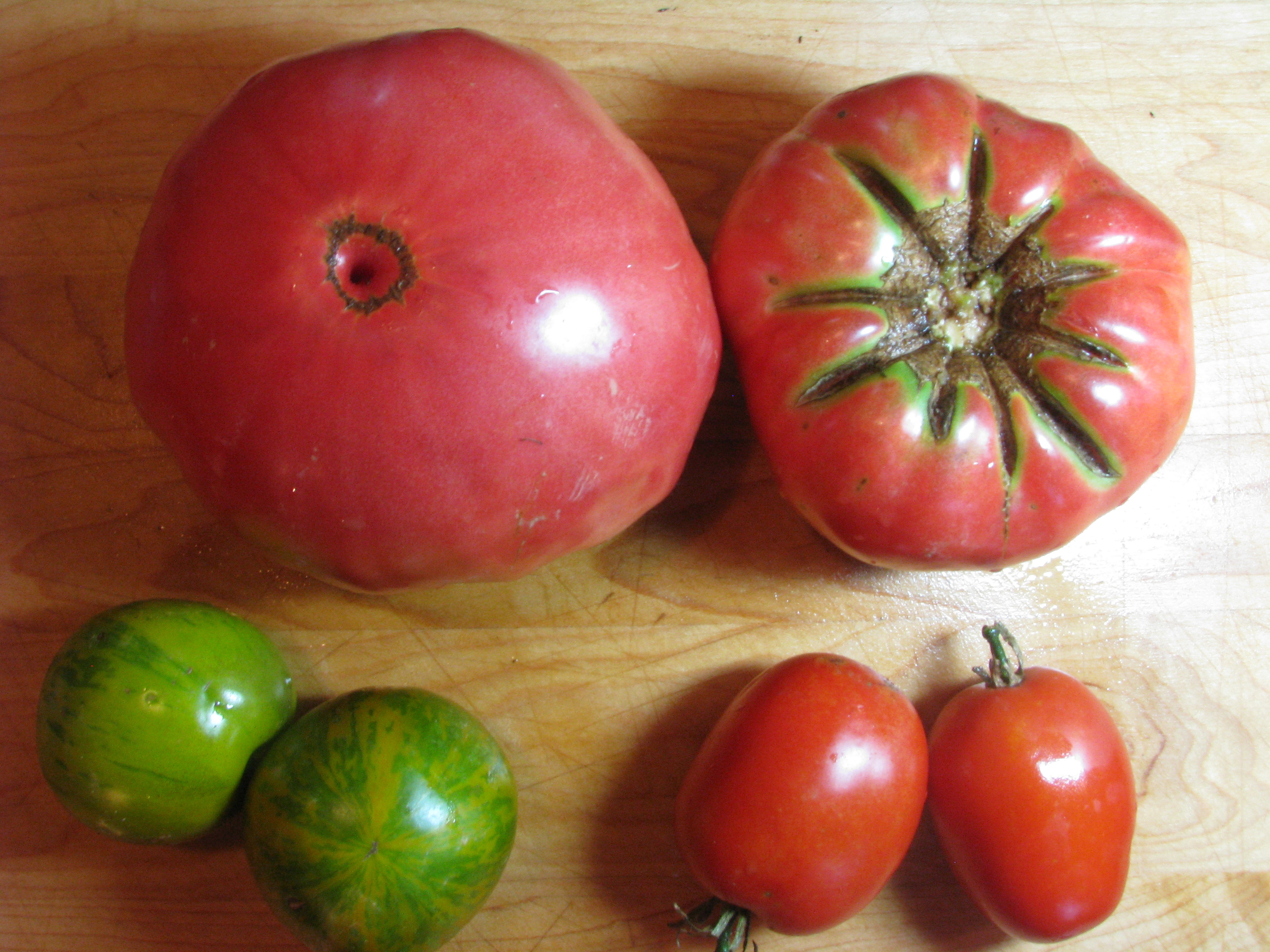 The big pink Belgian Beauty with a salty Green Zebra and the abundant plum tomato.